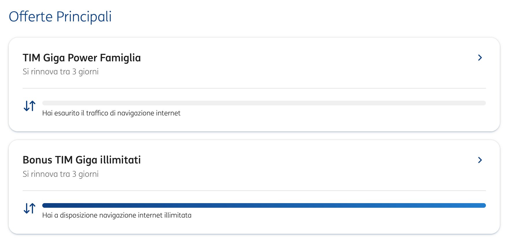 In pratica sotto TIM Giga Power Famiglia mi dice che ho esaurito il traffico a disposizione, mentre sotto Bonus TIM Giga illimitati mi dice che... ho a disposizione navigazione illimitata.