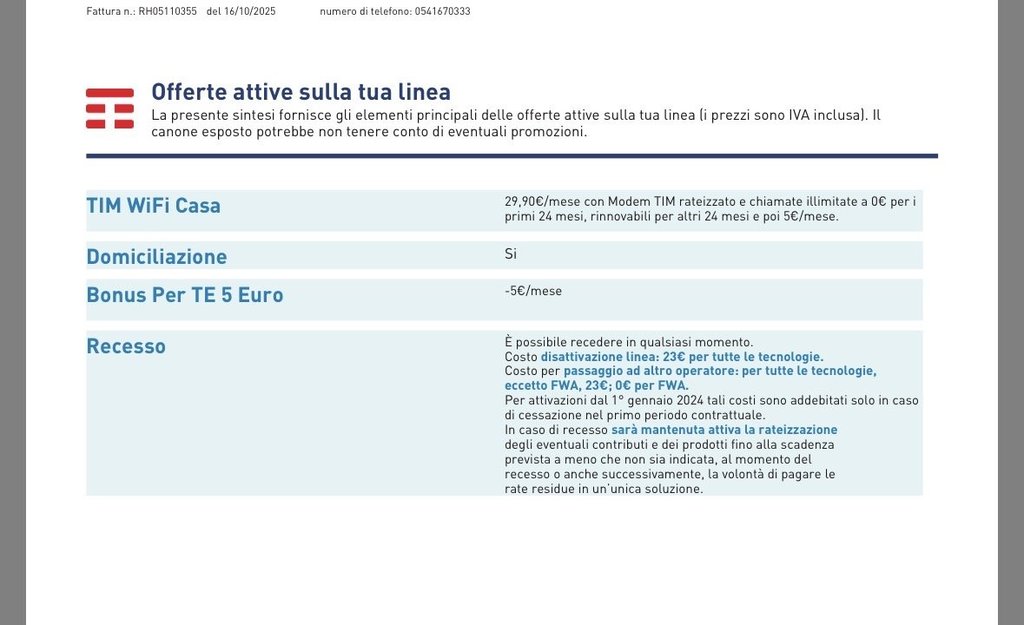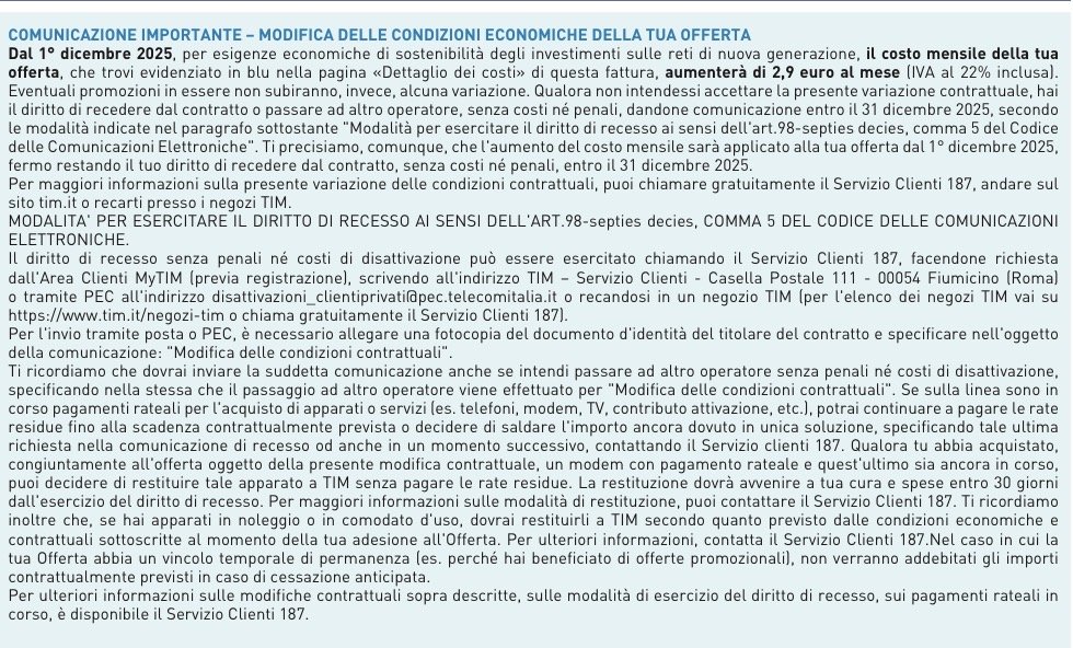 La comunicazione in fattura è però chiara: e pure quella conta, anzi, tu TIM non puoi dirmi per iscritto di fare una cosa che non posso fare, alla peggio mi stai autorizzando in quel momento.