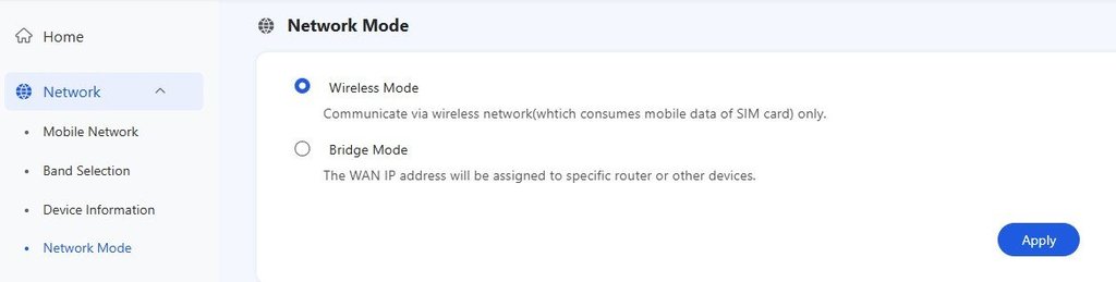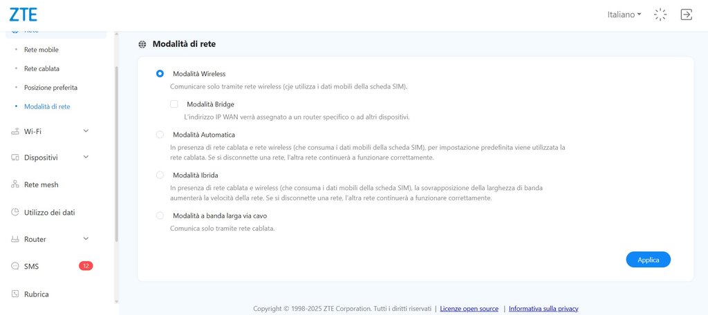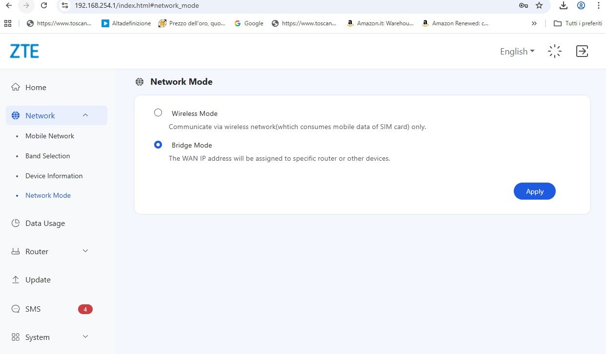 Inoltre, poiché vorrei settare lo ZTE come ROUTER MODE (come insegna 'MioNonno'), se vado su NETWORK MODE vedo solamente la possibilità di scegliere 'Bridge Mode' (già preimpostato) oppure 'Wireless Mode'.