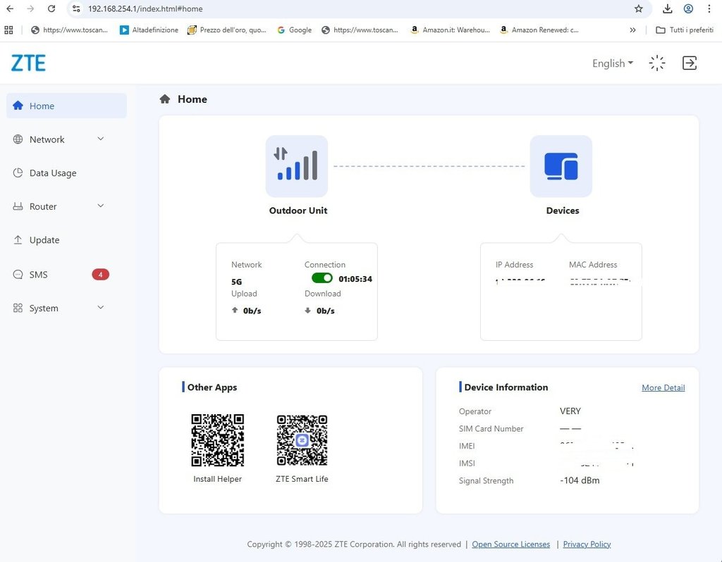 Ho modificato solamente la password di primo accesso, poi non ho toccato nulla. Ha da subito riconosciuto la SIM ed ho potuto subito navigare. Il PC era commesso direttamente allo ZTE.