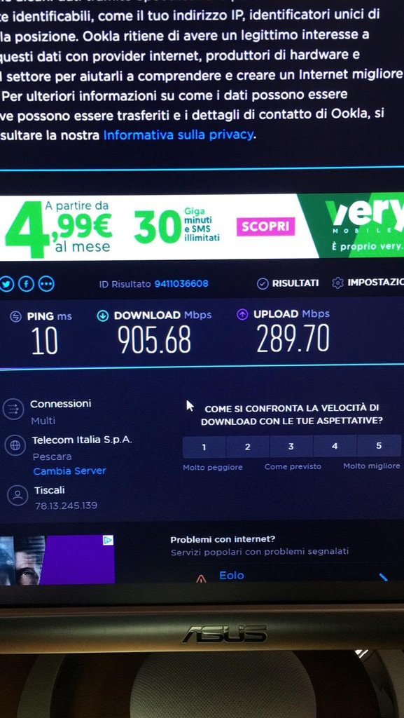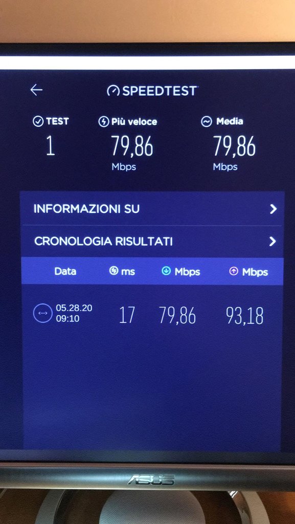 Fin dai primi giorni gli speed test effettuati erano al top, premesso che uso scheda Ethernet gigabit e cavo cat7, pertanto i primi speed test erano sui 900 e passa in download e quasi 300 in upload (come da premessa contrattuale) anche in WiFi i dati erano rilevanti, raggiungendo circa i 450 mega per secondo.