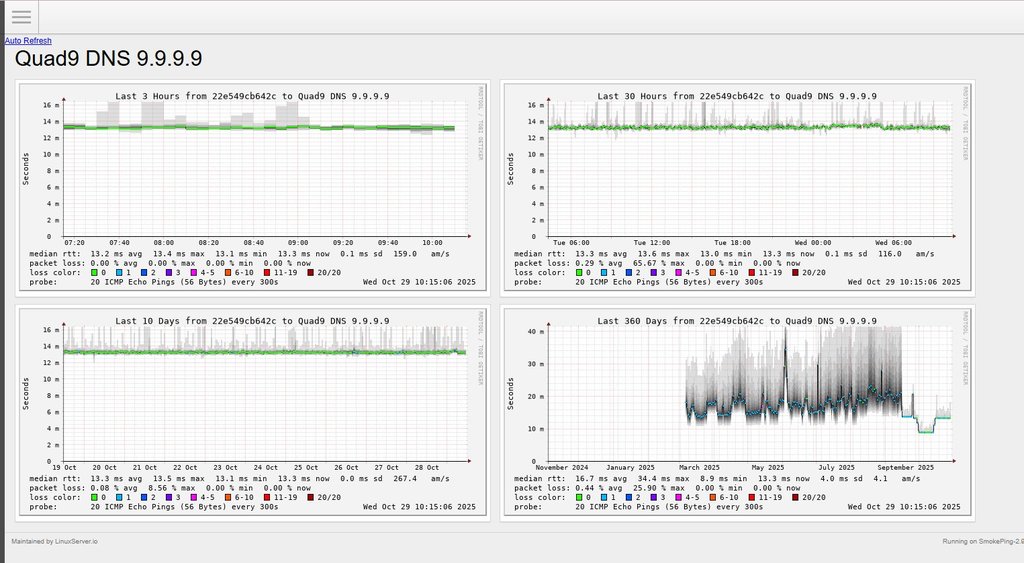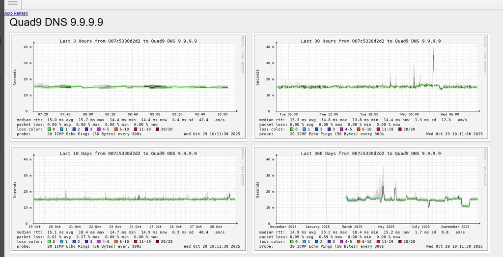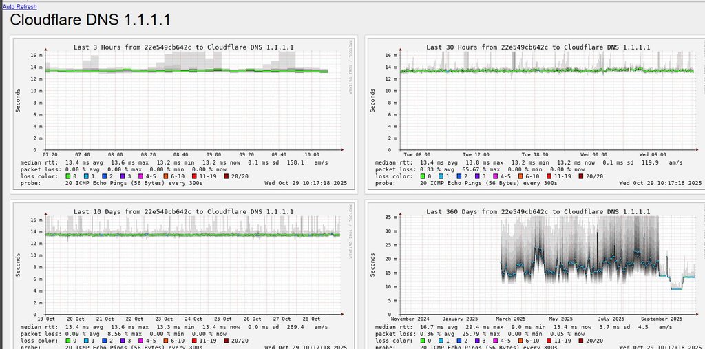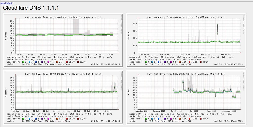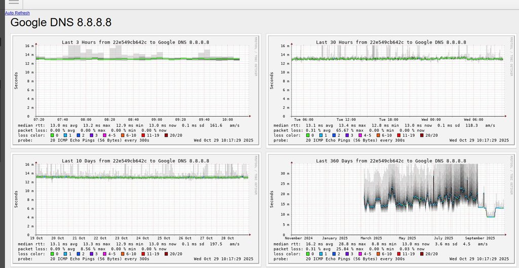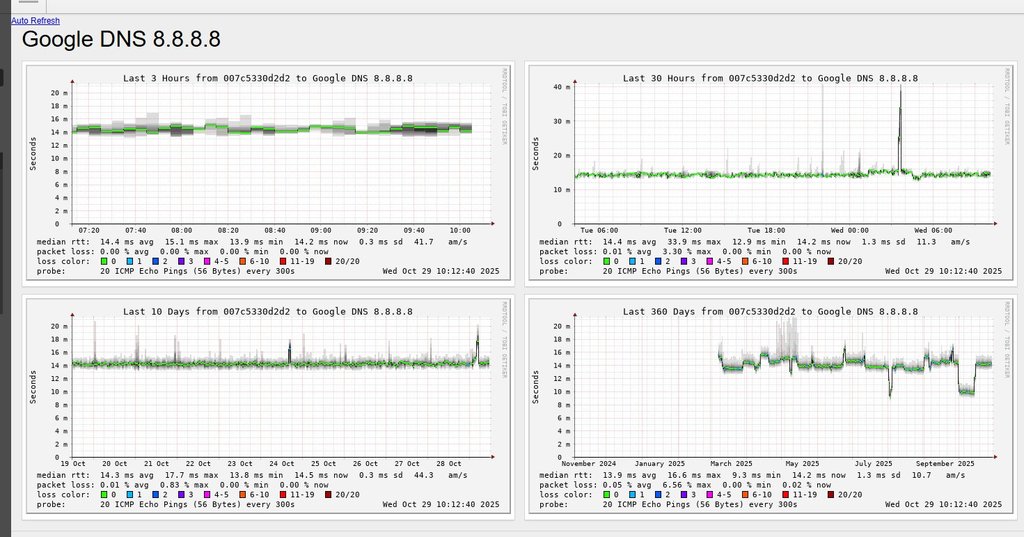 Stanotte, ad esempio, la connessione PPPoE è caduta per circa dieci minuti, probabilmente a causa di un aggiornamento. Io ho il backup su 4G, quindi durante quei dieci minuti si nota solo un aumento di latenza; sulla linea dei miei, invece, non c’è backup, ed è per questo che si è verificato così tanto packet loss.
