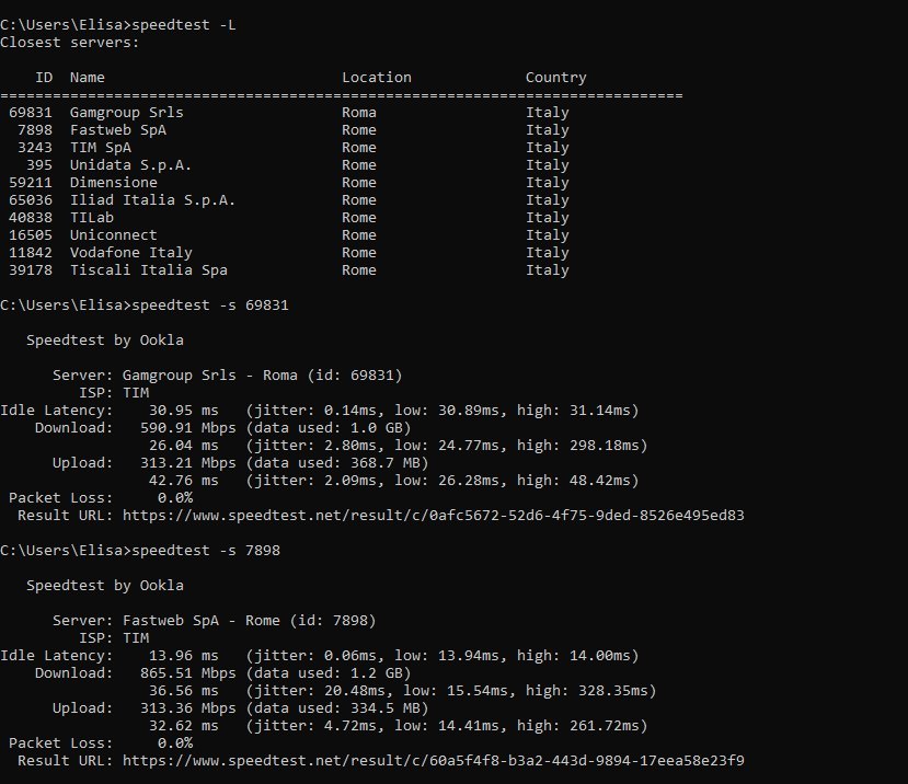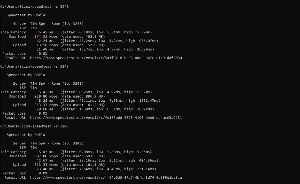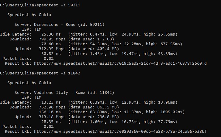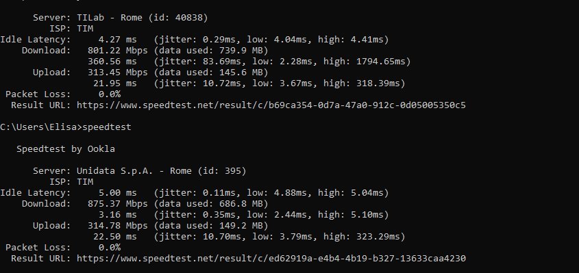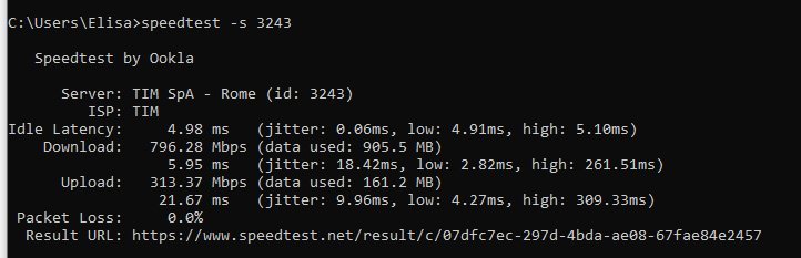 GoldDigger mkonsel ma se il server speedtest è di Roma l'instradamento praticamente non incide, ci saranno al massimo 4 hops... Inoltre anche facendomi assegnare n ip diversi lo speedtest non cambia, sempre a circa 810... A 940 non c'è andato MAI se non ieri sera... Adesso anche peggio del solito. Come si fa a risalire all'ip del server speedtest di Tim - Roma? Facendomi assegnare un ip nuovo i risultati sono: