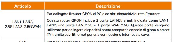 A me risulta che questo router abbia due porte ethernet 2,5G: una WAN, per collegamento ONT, ed un'altra LAN per collegarci un altro client che abbia, a sua volta, una porta ethernet 2,5G.