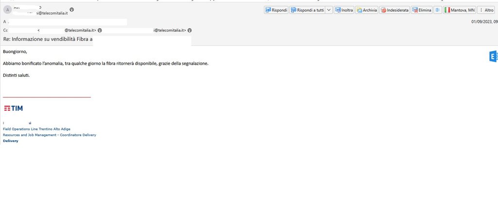 mattodinaturas io ho fatto una cosa simile alla tua e ho risolto... Ho trovato in Fibercop e in ditta appaltatrice persone super disponibili che si sono attivate per risolvere prontamente il problema. Nonostante la filosofia che gira su questo forum sia che è assolutamente vietato contattare Fibercop direttamente, forse per favorire l'attivazione di contratti con i soliti venditori che ci sono qui dentro. Nessuno ce l'ha con loro, anzi, ma a volte sembra che si dica il falso al solo fine di fargli stampare più contratti possibile. Mia modesta opinione