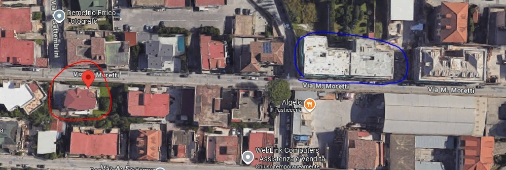 In rosso le coordinate che OF associa al civico, in blu dove mi porta maps cercando il civico.