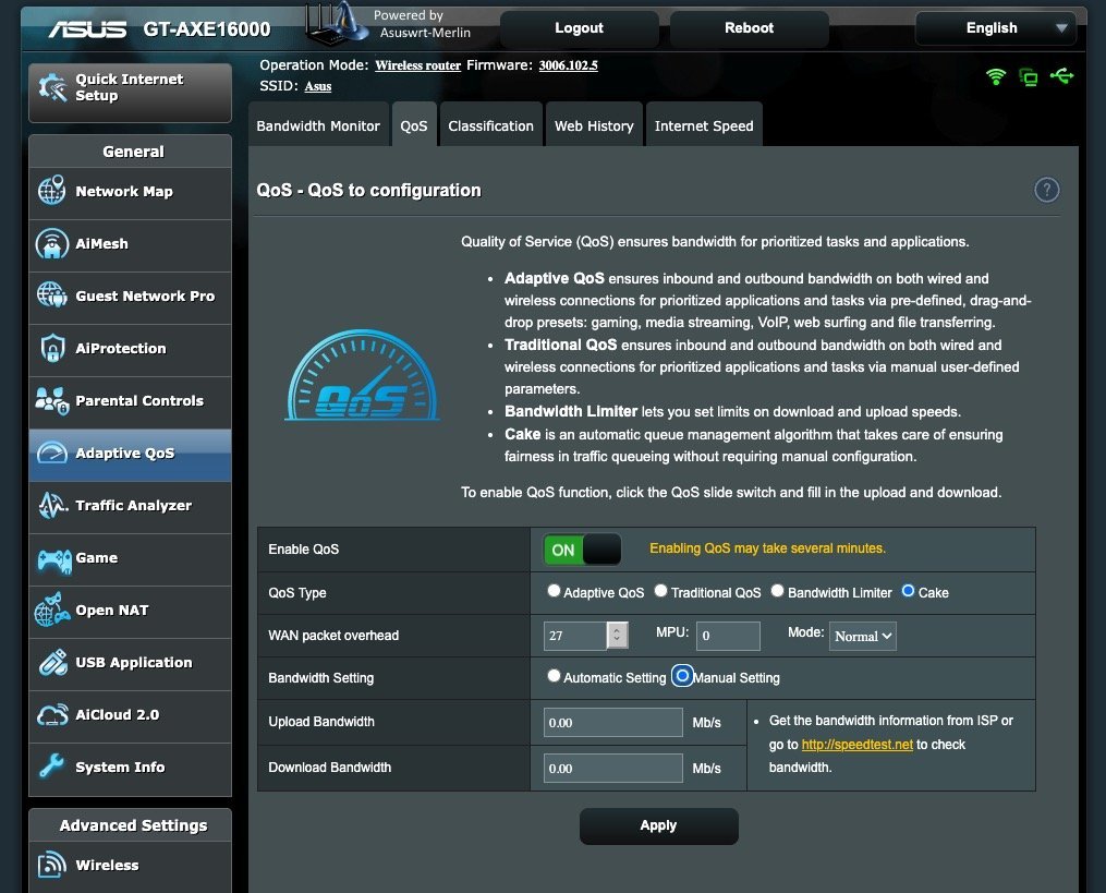 Magnus471 documibozu il QOS di Asus è un po' uno schifo purtroppo. Dovresti passare a Merlin (ma temo che l'ax3000 non lo supporti) che ha il supporto per cake. https://sourceforge.net/projects/asuswrt-merlin/files/RT-AX3000/ https://www.snbforums.com/threads/flexqos-1-4-6-flexible-qos-enhancement-script-for-adaptive-qos.90645/