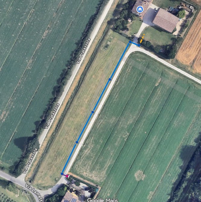 La tratta in blu è predisposta evitando il fosso che percorre quasi tutta la sua lunghezza. L'unico punto in cui incontro il fosso è nella tratta in viola. Il fosso ha una profondità di circa 20-30cm quindi adesso devo pensare a come predisporre il pozzetto per poi lasciare a tecnici lo spazio di manovra necessario per far si che il fosso non sia d'intralcio. E' probabile che mi allunghi di qualche metro in più per il posizionamento del pozzetto siccome il fosso finisce circa a quella distanza.