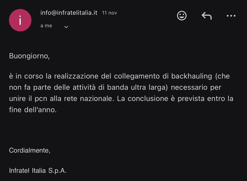 Allego anche comunicazione di Infratel. Le foto non sono mie, le ha fatte la mia compagna mentre ero a lavoro, ma non ha voluto disturbare gli operatori.