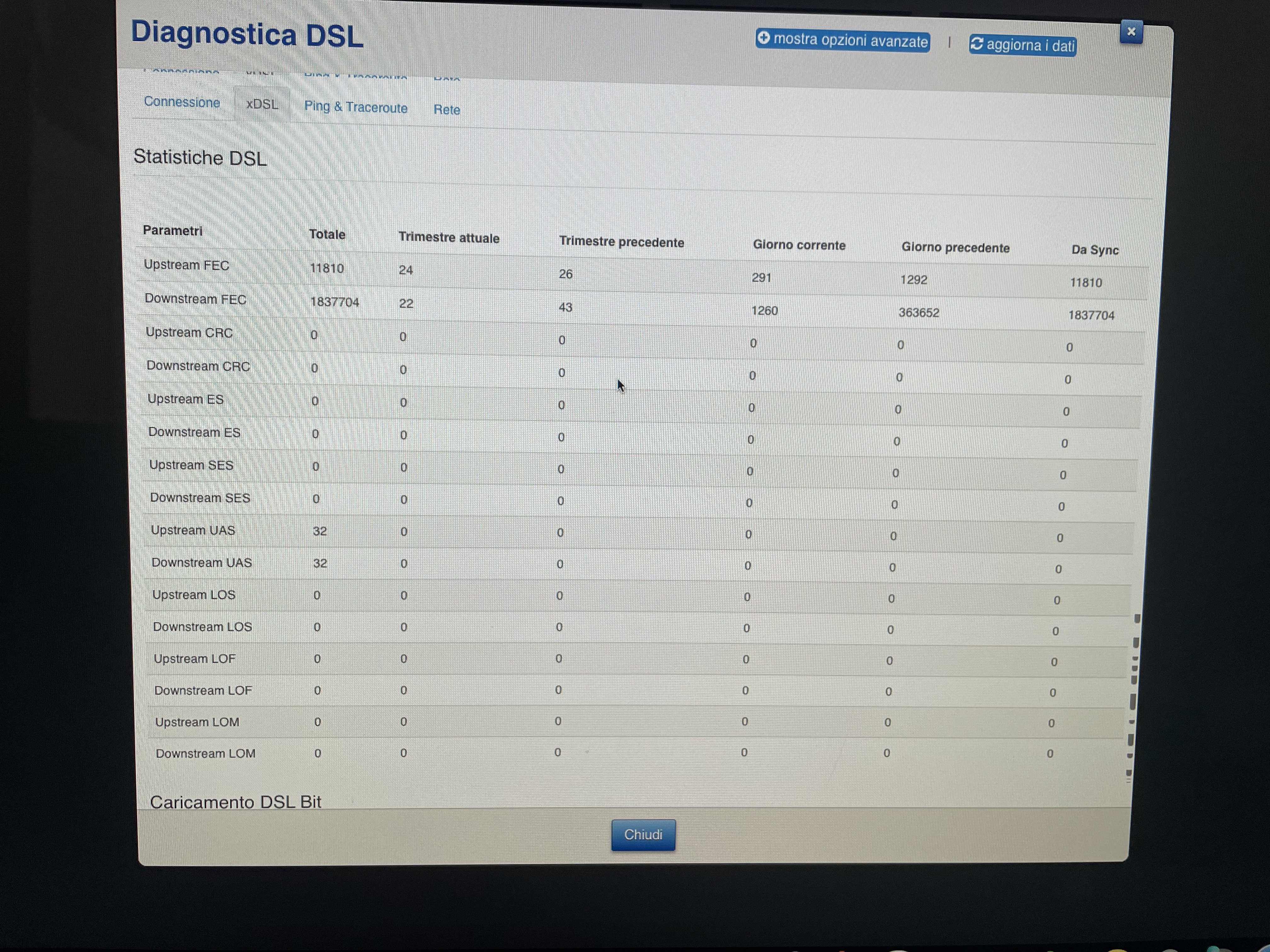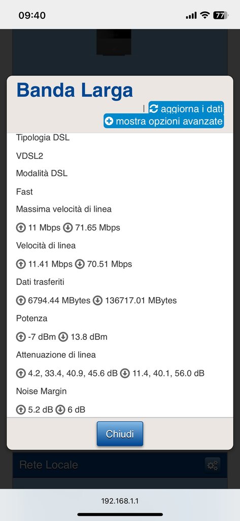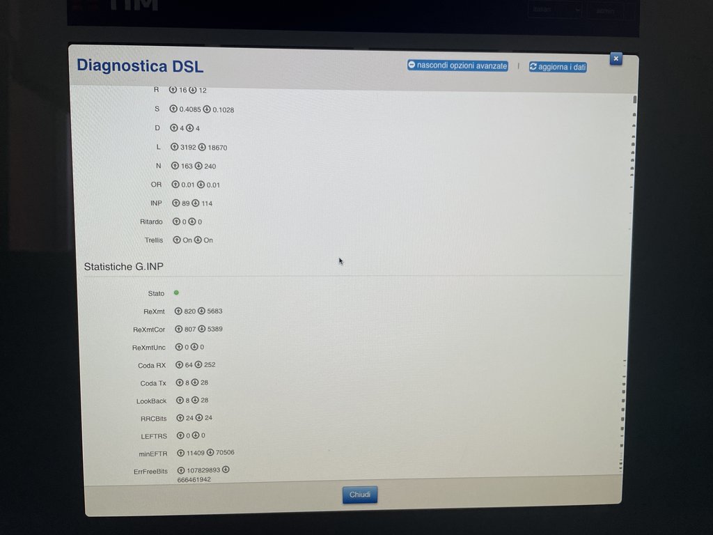 Hadx David1991 Vai in sezione diagnostica, e mandami lo screenshot della sezione con: errori crc, es, ses. Da quanto tempo è attivo il modem? Lo vedi più avanti nella sezione di cui hai messo lo screenshot qui: David1991