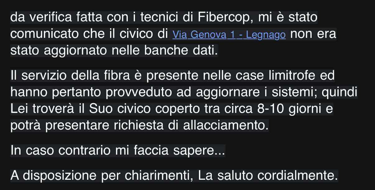 In passato Fibercop ha effettuato insieme a TIM dei lavori per portare la Fibra ottica a Legnago, ma ciononostante nella nostra abitazione non risulta esserci copertura: https://www.gruppotim.it/it/archivio-stampa/mercato/2021/CS-TIM-PORTA-A-LEGNAGO-LA-FIBRA-OTTICA-ULTRAVELOCE.html