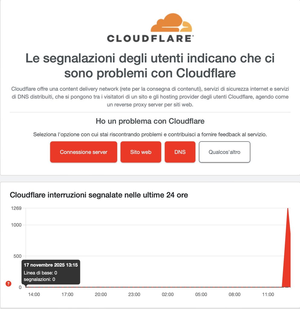 StoGatto Riporto quanto indicato da Cloudflare stessa: https://www.cloudflarestatus.com/incidents/8gmgl950y3h7