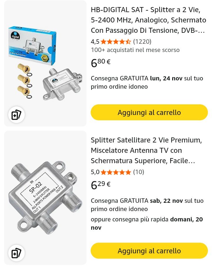 Riguardo allo splitter, andrebbe bene tipo anche uno di questi da così pochi soldi o essendo il segnale più "delicato" prevenendo dal satellite è meglio uno dal costo maggiore e di marchi conosciuti?