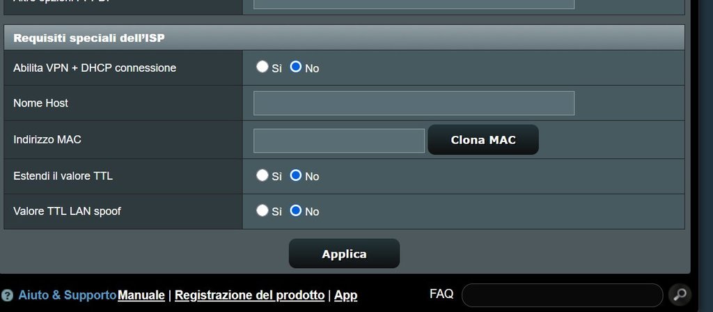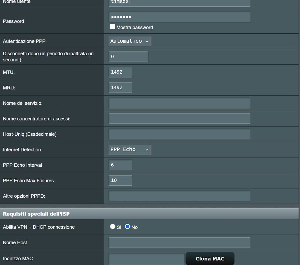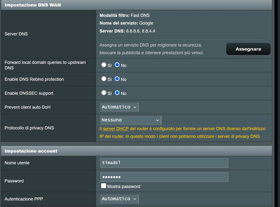 Con la configurazione allegata (che credo sia giusta, PPPoE senza VLAN perchè connessione secondaria), il Router ASUS mi conferma di essere connesso, ma non riesce a farmi navigare su internet in alcun modo, anche impostando come DNS quelli in uso sul TIM Hub.