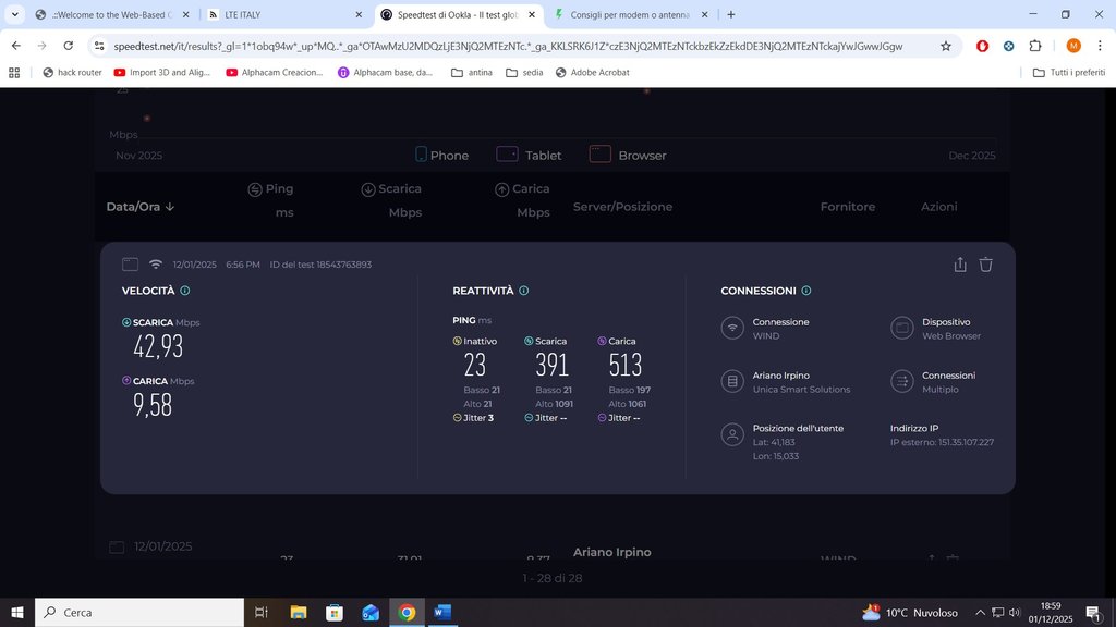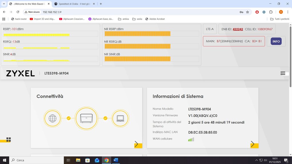 Per la Very Unlimited, visti i valori degli speedtest sul telefono, quelli dell'hack e la distanza, potresti pensare ad una CPE 5G usata (ZTE, Huawei, etc.), indoor o anche outdoor collegata ad un router interno.