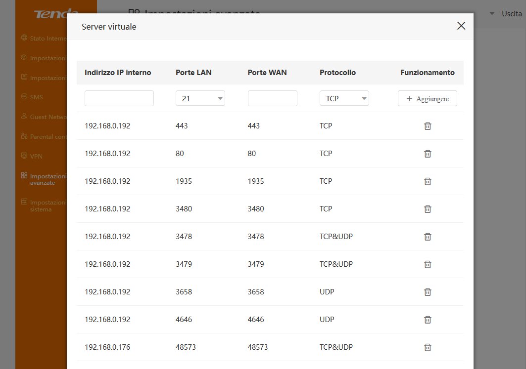 1) Navigando nel mio router Tenda, ho trovato quella che dovrebbe essere la sezione del port forwarding. È chiamata Server Virtuale. Questa è la schermata che ho davanti.