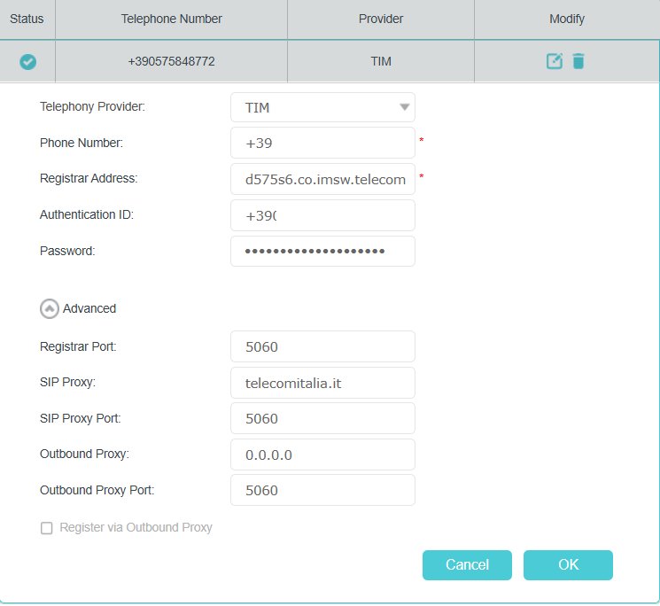 Buonasera, come da titolo il voip sul mio vr1210v funziona solo per le chiamate in entrata , se provo a effettuare chiamate, dopo l'invio dei toni dei numeri silenzio assoluto senza squilli di occupato/libero.Ho aperto una segnalazione a TIM e mi dicono che lato loro risulta tutto ok sulla linea, proveranno a fare "una verifica dell'instradamento delle chiamate in uscita dalla mia centrale" e mi faranno risapere tramite ticket... qualcuno ha suggerimenti su eventuali verifiche delle configurazioni prima di dare 90€ al tecnico? purtroppo modem voip ho solo questo.