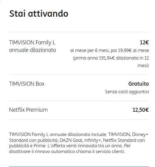 Per questo stavo pensando di fare Tim Vision avendo già Tim sulla seconda casa, ma qui mi chiedo se mi conviene farlo, poichè ho visto che ce il pacchetto completo con Netflix, Prime e Disney+, di base tim da i pacchetti base con pubblicità ma puoi cambiarli in fase di sottoscrizione e secondo i miei gusti il pacchetto verrebbe cosi: