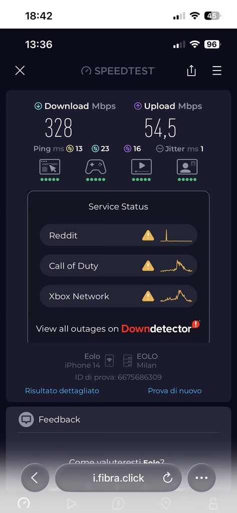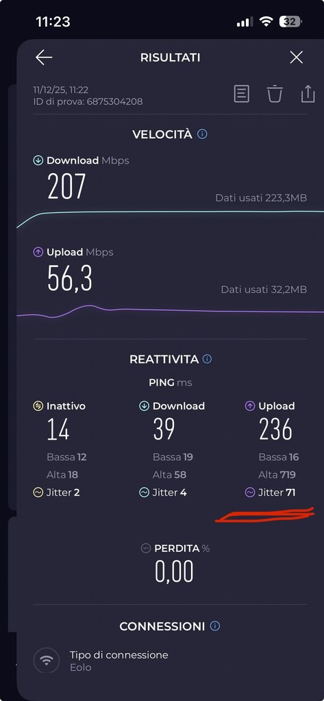Mi accorgo di aver perso circa 100 Mbps e, anche dall’app EOLO, risulto ora sotto “abbinamento fino a 200 mega”, quando nel mio paese la 300 è disponibile e, di fatto, l’ho avuta fino al giorno prima. I giochi tornano quindi ad andare male e, indovinate un po’ cosa è cambiato? Stesso identico discorso: si è alzato soltanto il jitter in upload.