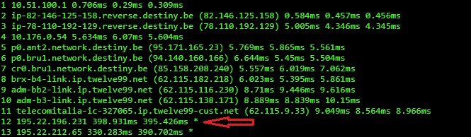 La causa per entrambi i "cluster" di server impattati era abbastanza simile, ovvero un nodo di uplink ad Amsterdam, nell'interconnessione tra TI Sparkle e Cogent e tra Ti Sparkle e Arelion, esempio di uno dei server coinvolti: