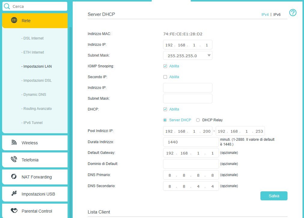 Se mai, dalla sezione LAN puoi vedere il suo indirizzo IP di rete interna, ed è quello l'IP che devi mettere sul server DHCP come default gateway (o sui vari dispositivi se metti a mano gli indirizzi IP nel caso non vuolessi usare DHCP).