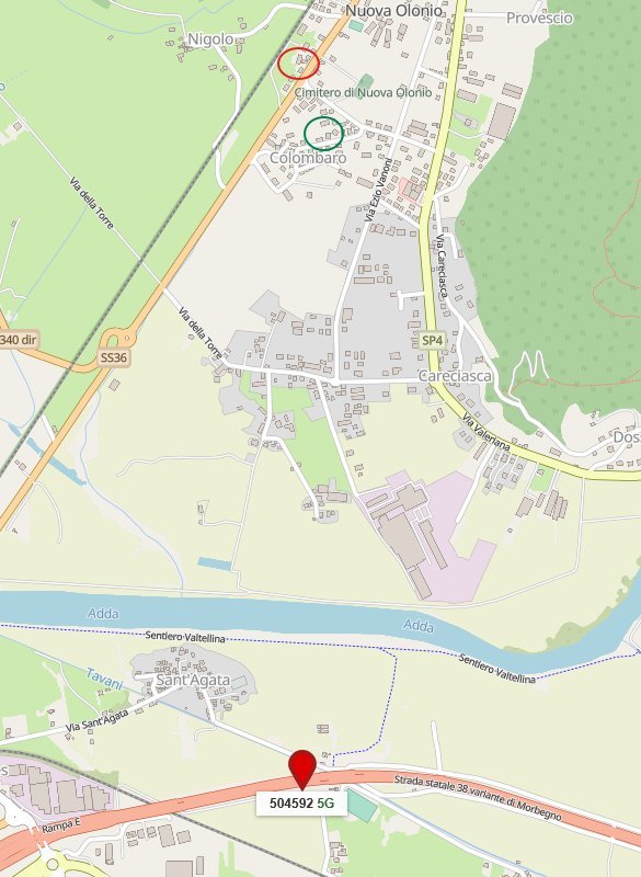 Salve a tutti, sono venuti ad installarmi la FWA 5G di TIM nella mappa che vi allego si vede il cerchio rosso è casa mia, il cerchio verde è casa di un amico che ha la stessa connessione e l'antenna a cui penso ci colleghiamo, è la più vicina, google dice che io sono a 2,3km in linea d'aria.