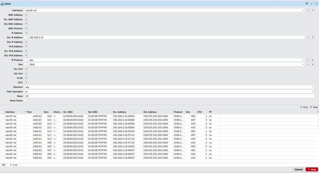 Certamente, questi sono gli unici pacchetti UDP su porta 1900 che vedo in uscita dal decoder (192.168.3.16), poi, nonostante le regole di firewall e mDNS attivo, non vedo gli stessi trasferiti sulla VLAN del wifi.