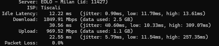 Va, nessun piantamento in particolare, dalle mie parti il kit vula FW pare abbia problemi con alcuni operatori ed ho voluto evitare. La banda indubbiamente scende, ho toccato 500-600Mbps di picco minimo nella sera del 28 Gennaio (abbastanza intensa causa molte partite). Ping e jitter estremamente stabili con 0 packet loss.