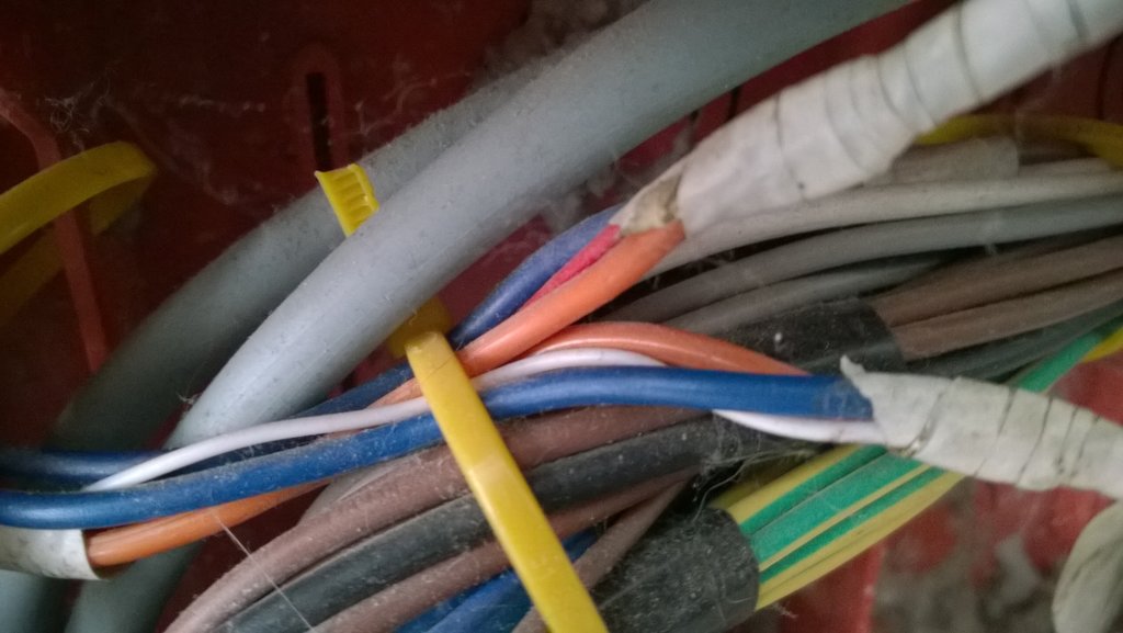 Come si può vedere (polvere e ragnatele a parte) il doppino telecom viene sdoppiato e giuntato ai cavi blu e arancione che presumo vadano a ciascuna delle due prese secondarie. ma è possibile che vengano usati dei cavi elettrici per fare delle prolunghe del genere?