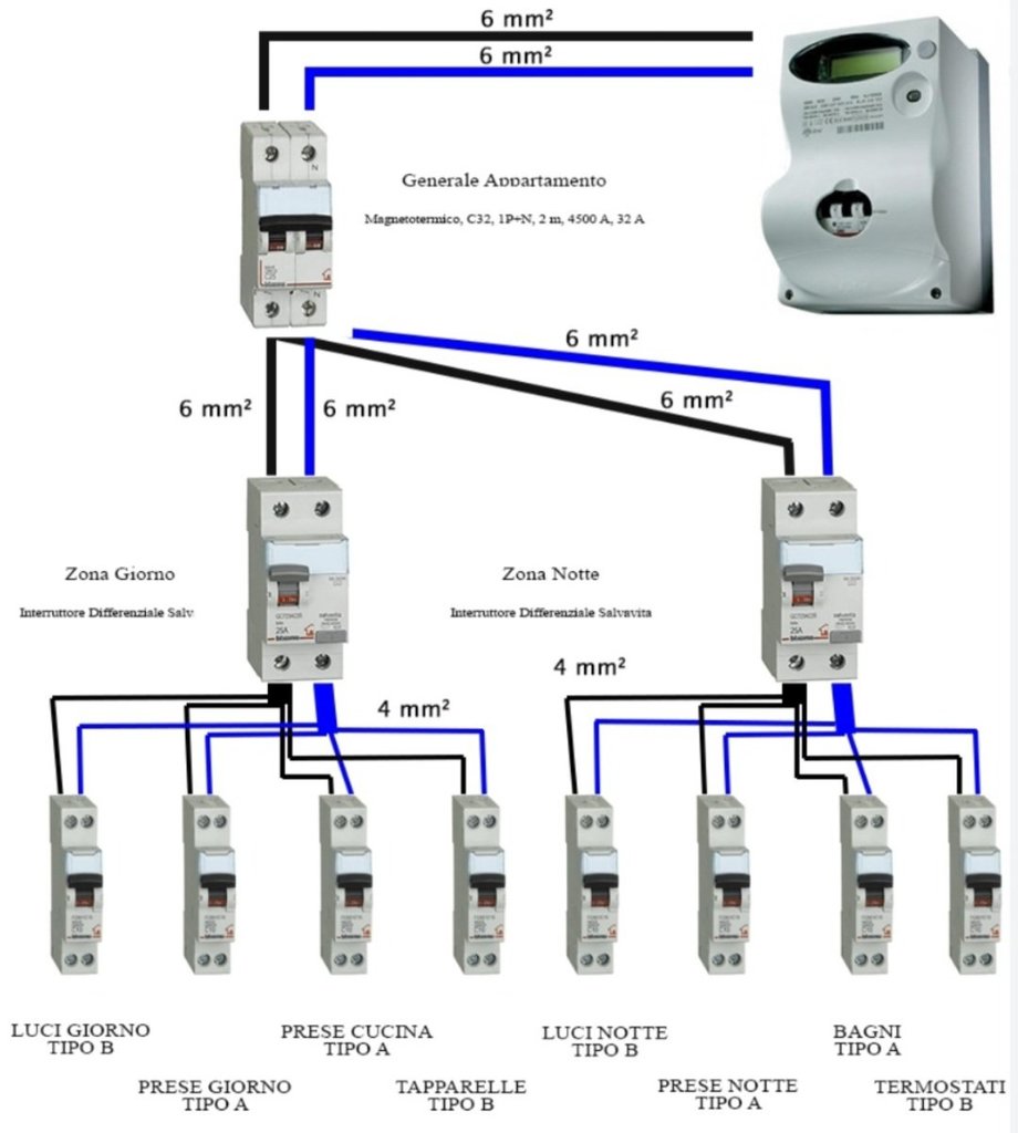 Poi la parte che mi interessa di più é questa, prendendo come esempio proprio questo schema, mettiamo che entra acqua in una presa in cucina, mi scatta solo quello piccolo nero dedicato appunto alle prese della cucina, o scatta quello grigio "Zona Giorno", che quindi funziona tutto nella zona notte ma non avrei corrente in tutta la cucina?