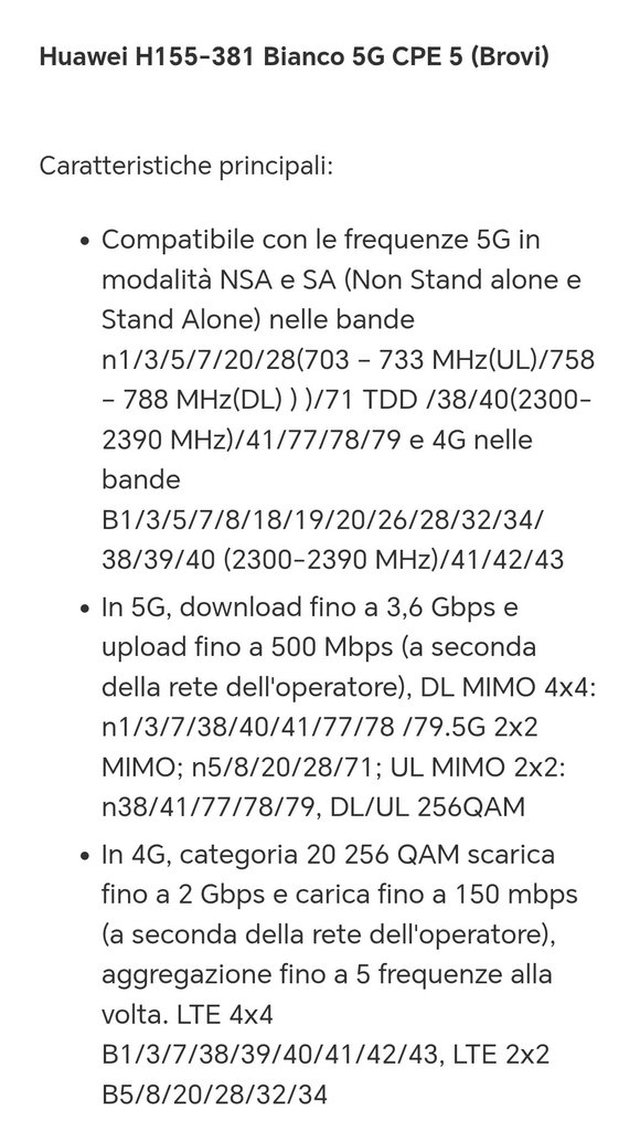 Vorrei un vostro consiglio, ossia considerando la BTS Vodafone a cui mi aggancio, che ha un N78 ed N28 ed i valori in foto, ha senso comprare il modem 5g Huawei/ Brovi H165-383? Io sono già possessore del Brovi H155-381 che ha un 5g DL mimo 4x4 n78 e 2x2 mimo n28 appunto le bande in 5g che io ricevo, unica differenza mi sembra di capire dalla scheda tecnica ha il 5G DL Mimo 8x8 relativo alla banda N78 e 4x4 mimo N28. C'è da capire solo se la BTS a cui mi aggancio supporta il mimo 8x8 in 5G oppure ormai lo supportano di default le BTS con N78 incluso?