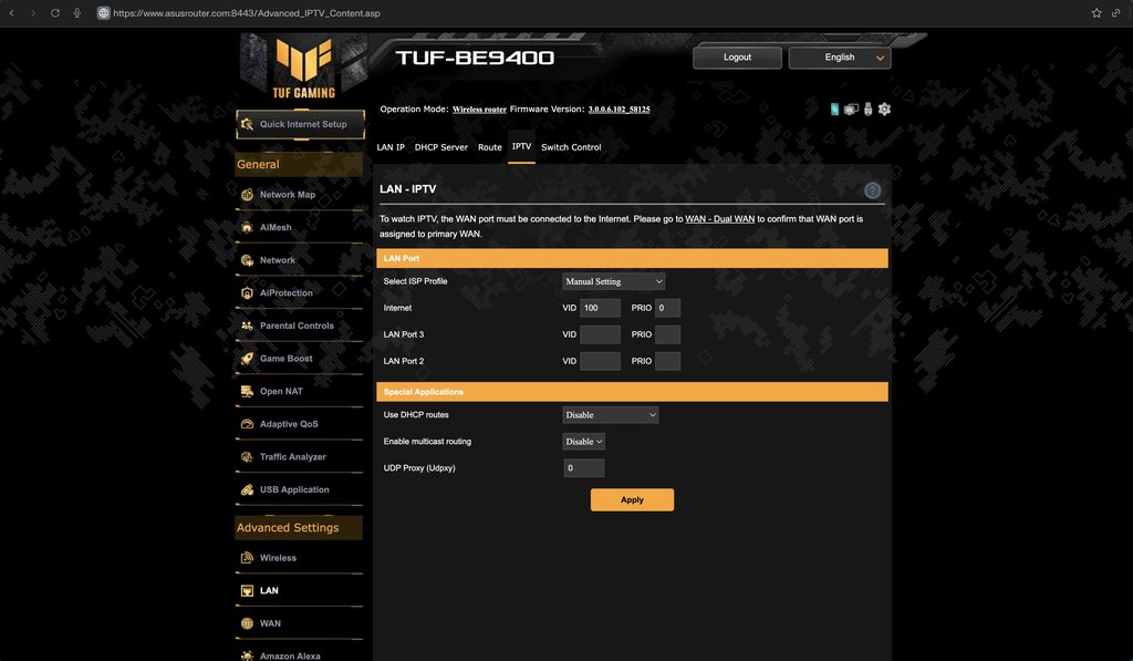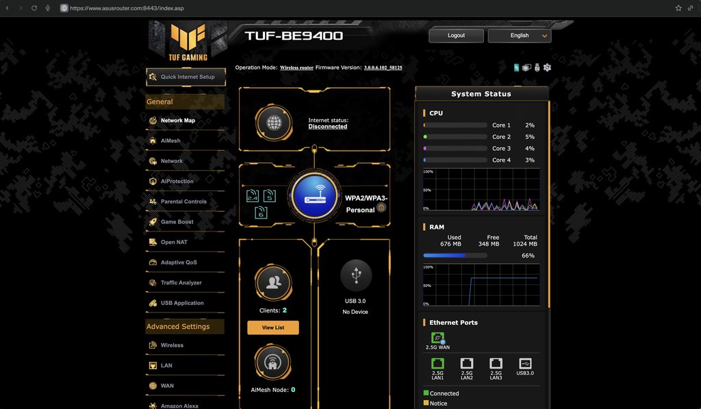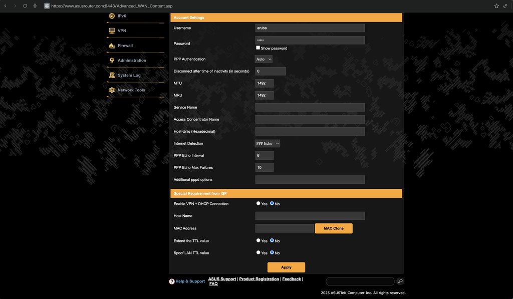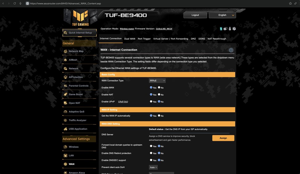Ho poi provato con un altro router, ASUS TUF BE9400. Qui le impostazioni sono più avanzate ed ho letto da un altro post che il WAN è da impostare su due sezioni per via di un bug ma nonostante i vari tentativi in System Log - General Log vedo: