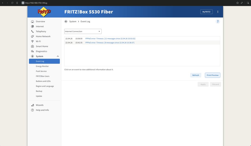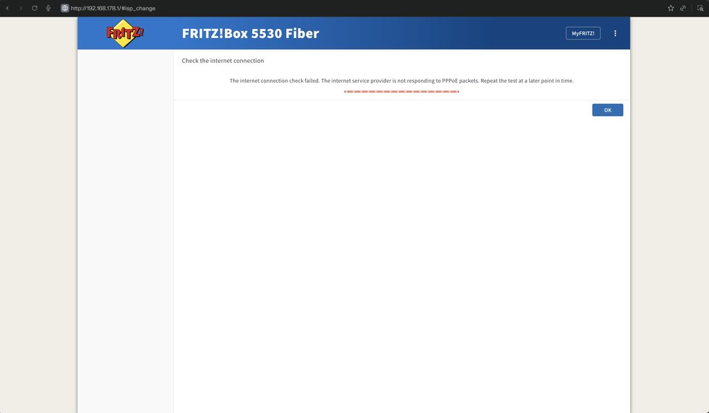 Tutti e tre sembrano dare errore di pacchetti in ricezione, FRITZ!Box: “The internet service provider is not responding to PPPoE packets.”
