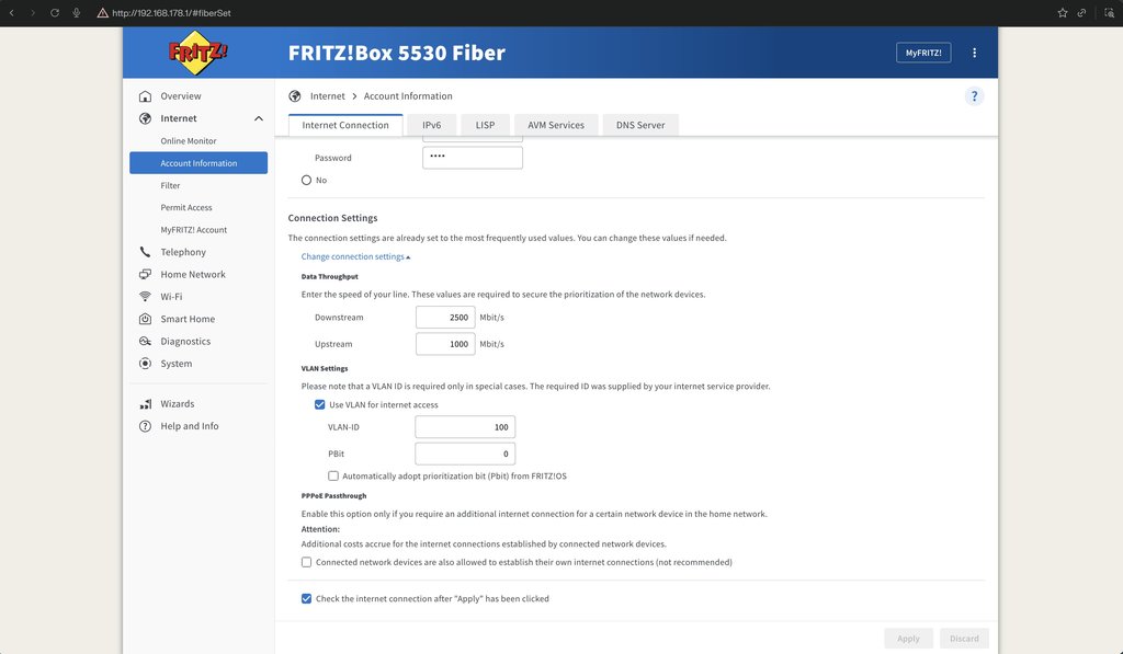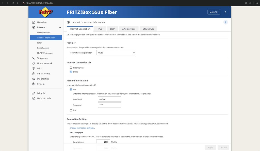 Ed infine visto che per il call center e il tecnico installatore la colpa è ora del mio router.. ho provato oggi con il modello Fritz Box consigliato (5530) e copiato pari pari la guida (PPPoE, VLAN 100, PBit 0, credenziali aruba/aruba) ma comunque nulla..