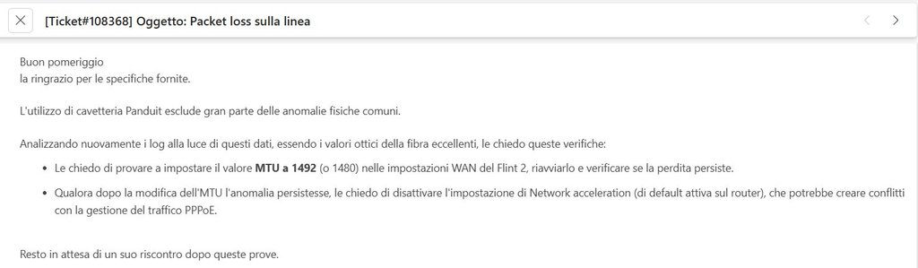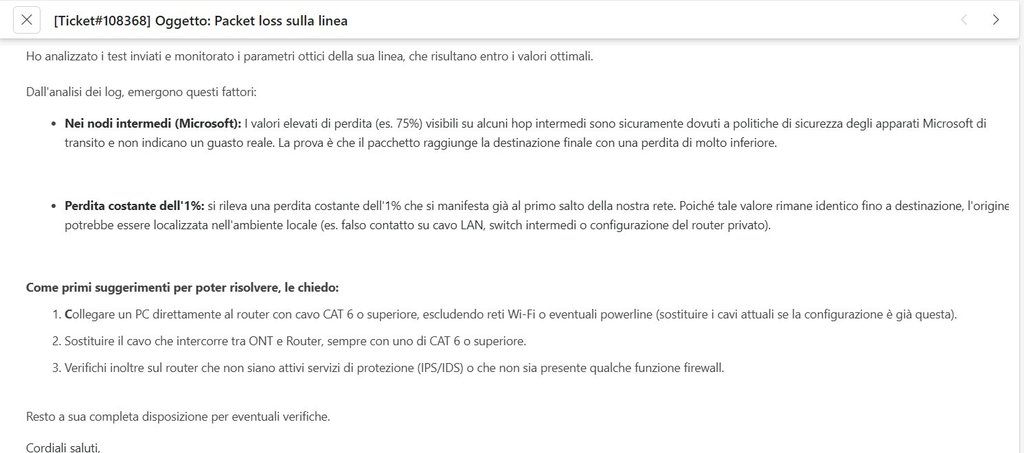 Mandata richiesta via ticket, resto in attesa di risposta, nel mentre questa é la risposta del mio ISP alla perdita di pacchetti :