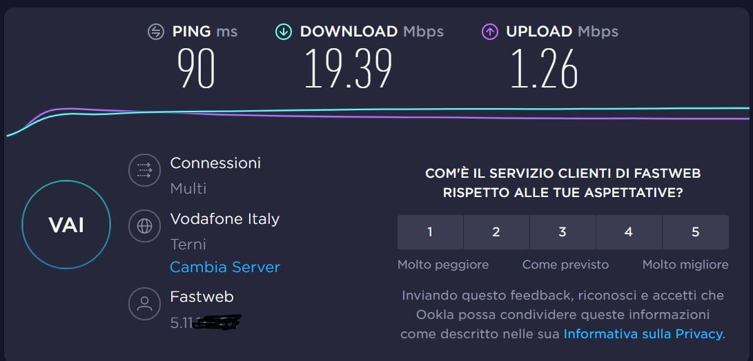 Mai una soddisfazione. Poi i blocchi, il loro modem mediocre, al mattino impossibile la DaD per i miei 3 figli...... sono da agosto che regalo 21 euro al mese e di fatto solo tim mi ha garantito continuamente e sempre il servizio, compresa DaD, streaming a tutte le ore, escluso un paio di gg che avevano la bts in manutenzione (vedevo i camion dei tecnici parcheggiati sotto).