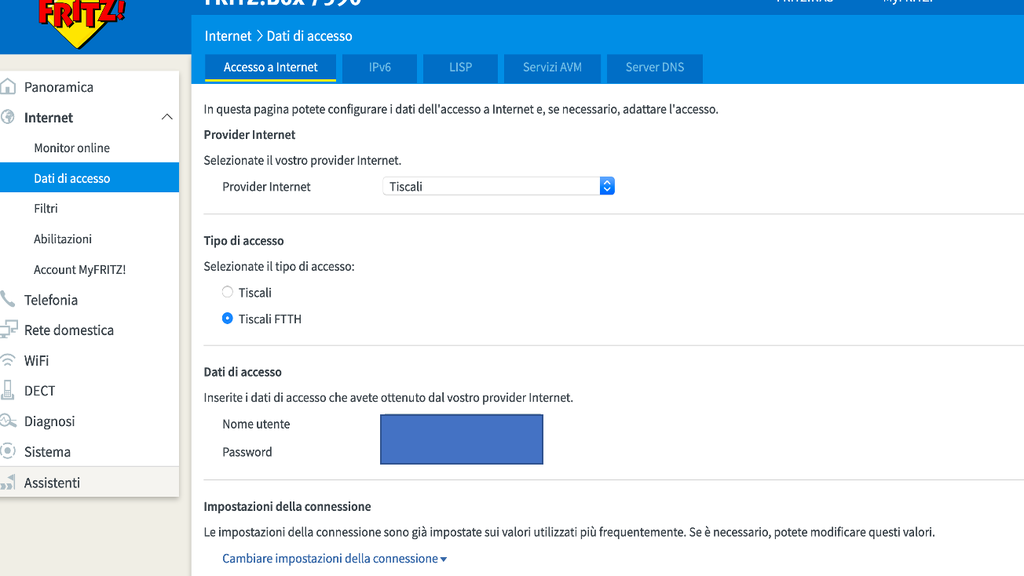 Dopo averlo collegato via ethernet all ONT tramite la porta WAN, inserisco nell' assistente del Fritz le informazioni selezionando Tiscali FTTH e inserendo User ID PPP e Password PPP.