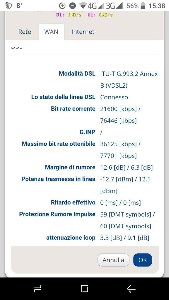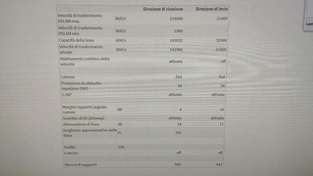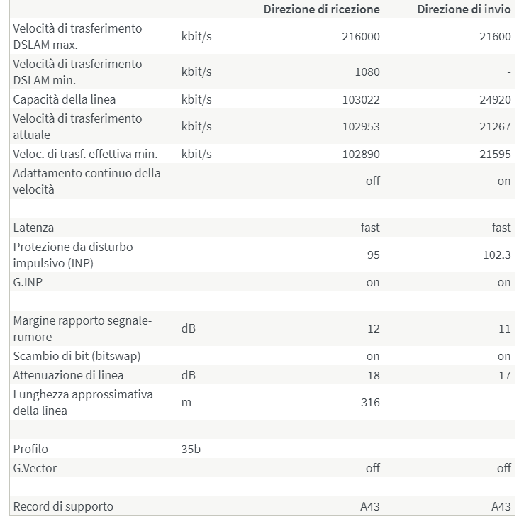 Velocità effettiva: 145/20, diventati 103/20 a seguito dell'attivazione del profilo SOS - No vectoring (che penso non arriverà mai essendoci anche il DSLAM FW)