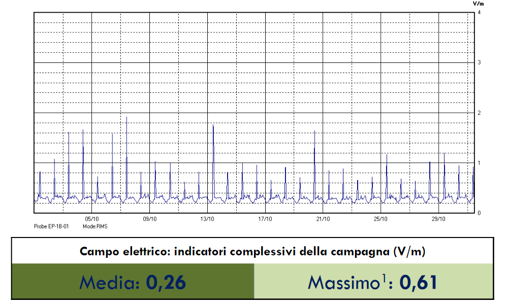 Ottobre 2019, edificio del comune. Media 0,26 V/m. 24 volte sotto il limite.