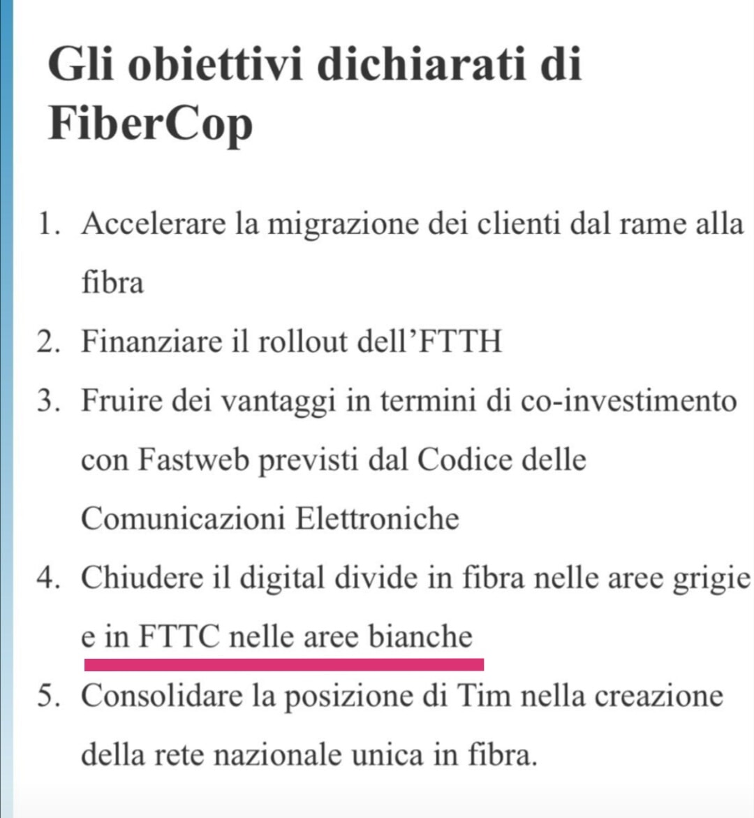Che utilizzerallo la fibra marcio rame per accelerare la "copertura" UBB in area bianca; che sarà inutile perché molte unità immobiliari distano più di un KM dal cabinet.