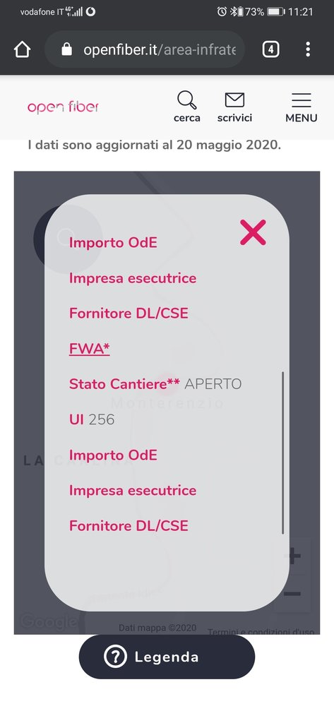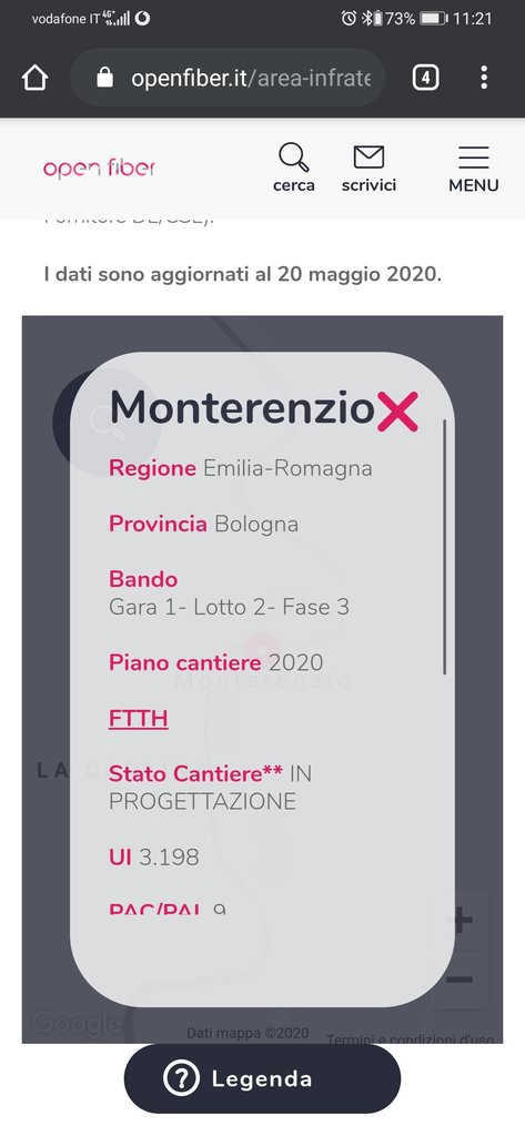 Scrivo per sapere se qualcuno di voi sa darmi qualche informazione in più sullo stato di avanzamento del mio comune ovvero Monterenzio in provincia di Bologna che risulta su OF in progettazione con cantiere previsto per il 2020 e con cantiere fwa aperto
