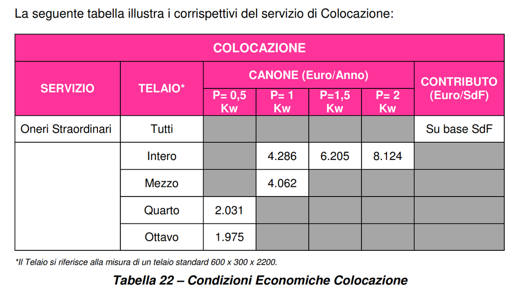 Riporto un post di un'altra discussione per riprendere un discorso legato fatto con @ThomasGallo... data questa immagine, chi è il pazzo che va ad affittare un ottavo o mezzo armadio, data l'irrisoria (50€ e 200€/anno rispettivamente) differenza con il tier superiore? Seriamente, che senso hanno questi prezzi? Mi vogliono dire che su un PCN il costo "rilevante" non è tanto lo spazio (che come detto è ben poco!!!) ma la potenza impegnata?